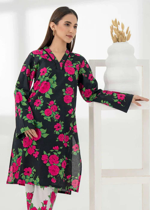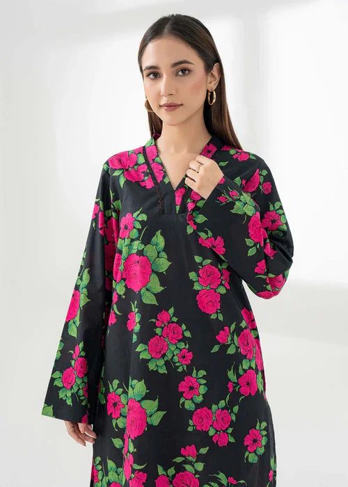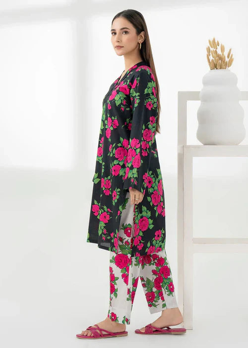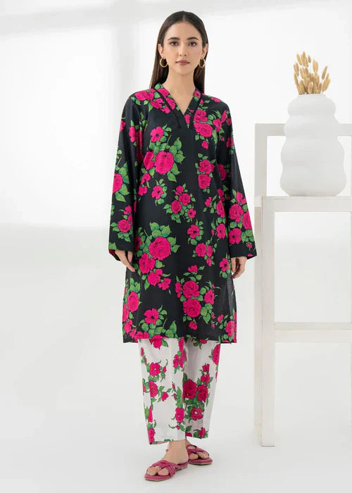 A vibrant fusion of sky blue and tangerine, enriched with delicate floral and foliage motifs. Intricate geometric detailing on the hem elevates this eye-catching look, paired with matching printed pants for a striking summer statement.